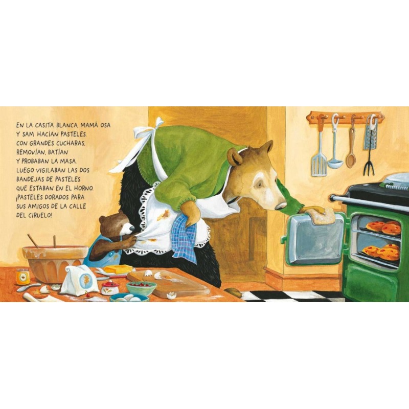 Todavía no había amanecido en la calle del Ciruelo, pero en la casita blanca Sam y su mamá osa cocinaban pasteles para repartir entre todos los vecinos.¡Sam estaba tan impaciente! No podía esperar a que salieran del horno. Al fin, metieron los pasteles en doce bolsitas y subieron a la camioneta. Cuando llegaron a la primera casa, mamá osa le pidió a Sam que llevase la bolsa sorpresa hasta la puerta. Sam dudó temeroso. ¿Cómo iba a hacerlo él solo?
