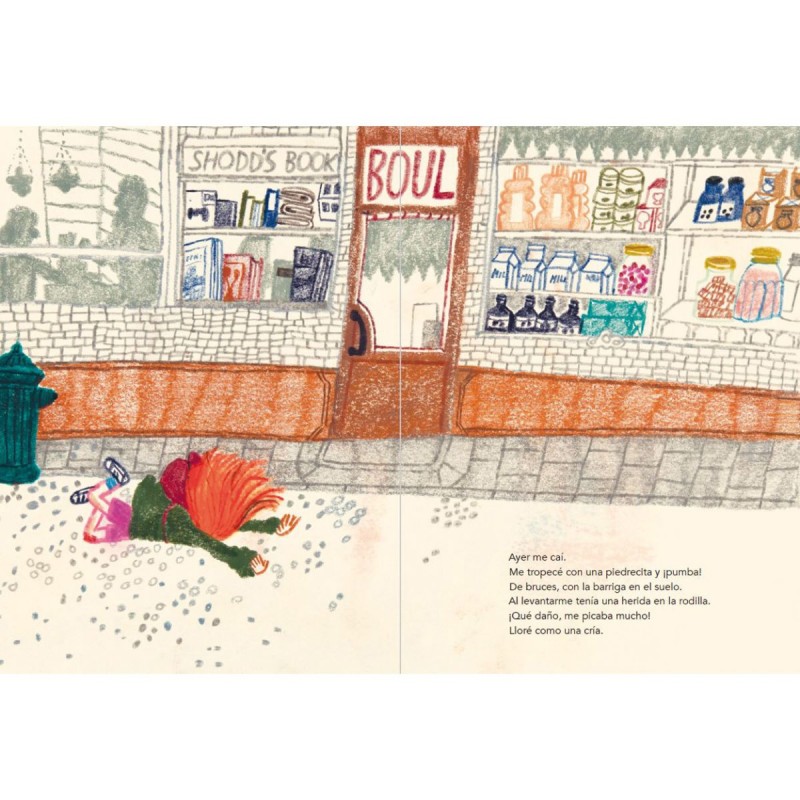 «Ayer me caí. Me tropecé con una piedrecita y ¡pumba! De bruces, con la barriga en el suelo. Al levantarme tenía una herida en la rodilla. ¡Qué daño, me picaba mucho! Lloré como una cría.»
