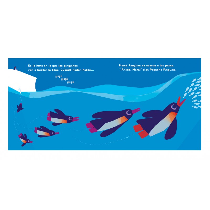 Mamá Pingüina sale a buscar la cena. Salta, nada, escala un resbaladizo acantilado y pasa de puntillas… ¡junto a unas feroces focas dormidas! Pequeña Pingüina la mira desde lejos y pregunta: «¿Mami volverá pronto?». “Seguro que sí”, dice Papá Pingüino ¿Conseguirá Mamá Pingüina reunirse con su familia a tiempo para la cena?