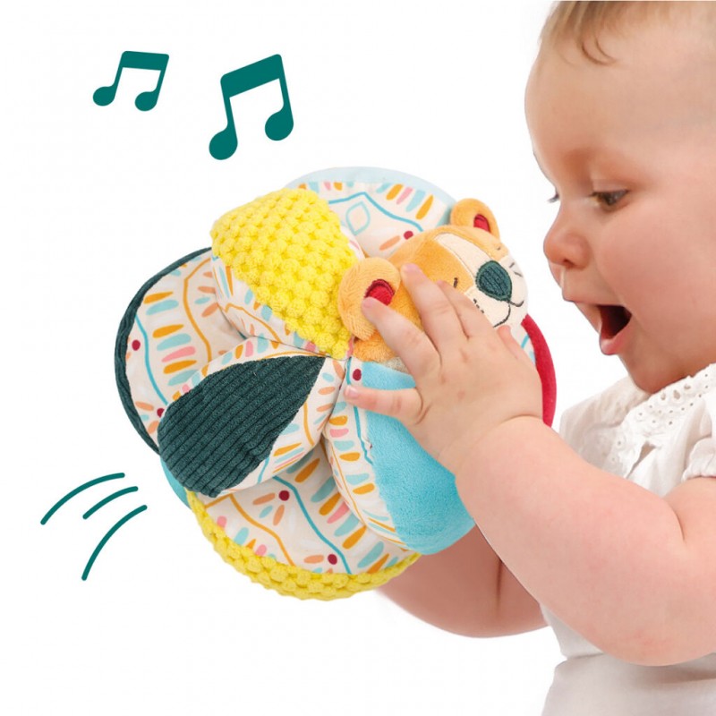 Una pelota blandita de fácil agarre con muchas texturas. Un material de juego para bebés, que estimula el movimiento y el descubrimiento del entorno. Sensorial y divertido.