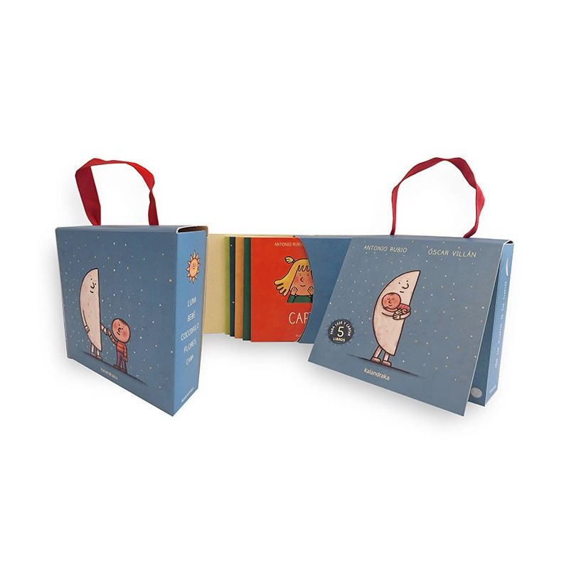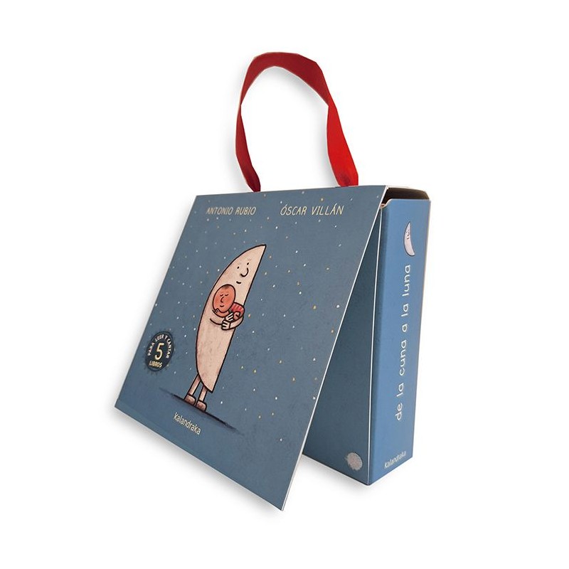 Una hermosa maleta que contiene 5 títulos de la famosa colección para bebés "De la cuna a la luna": Luna, Cocodrilo, Bebé, Flores y Cara.