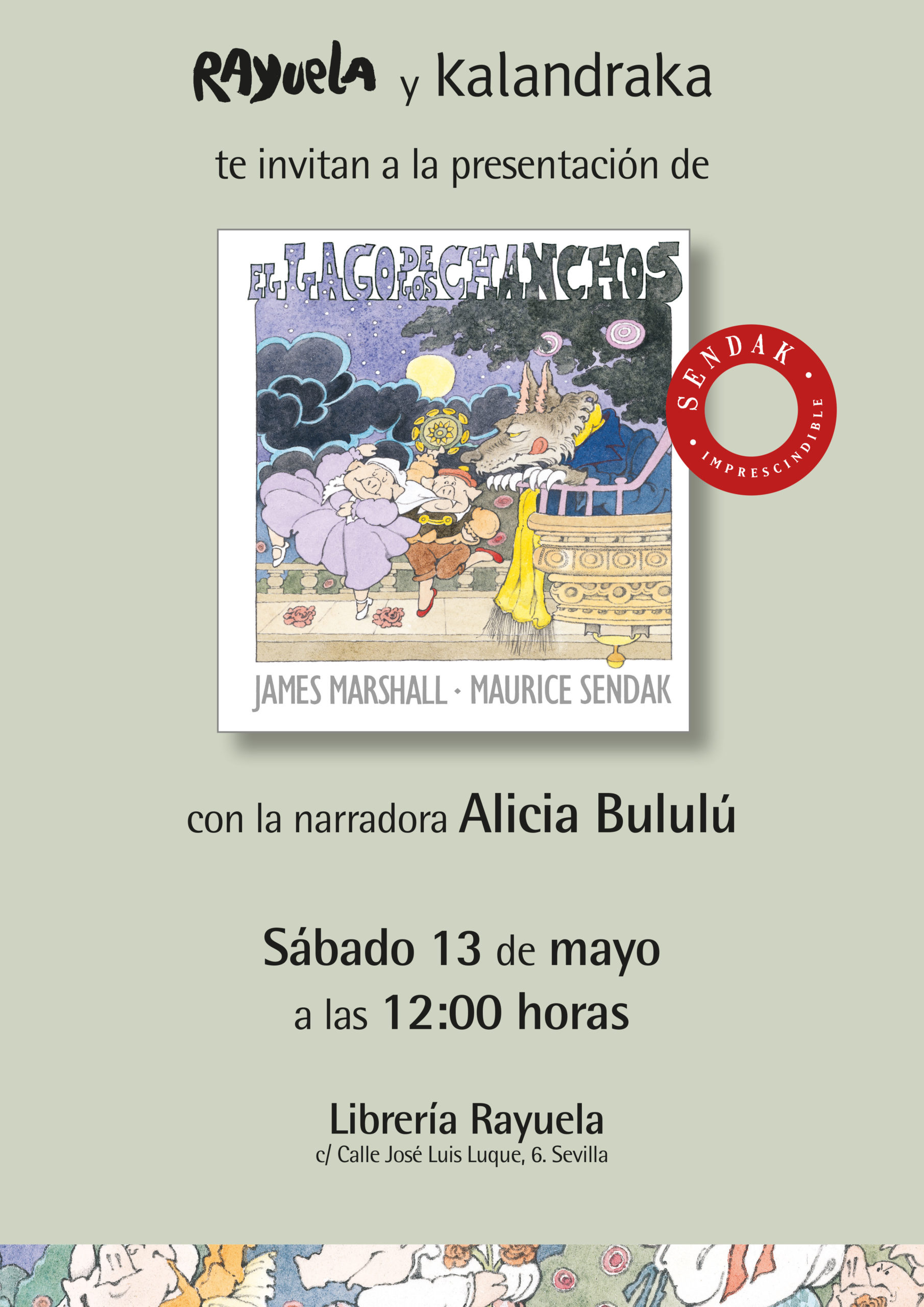 Este sábado 13 de Mayo a las 12:00h. en Rayuela te invitamos junto a la editorial Kalandraka a disfrutar de la presentación del cuento «El lago de los chanchos» del gran Maurice Sendak con la narración de Alicia Bululú.