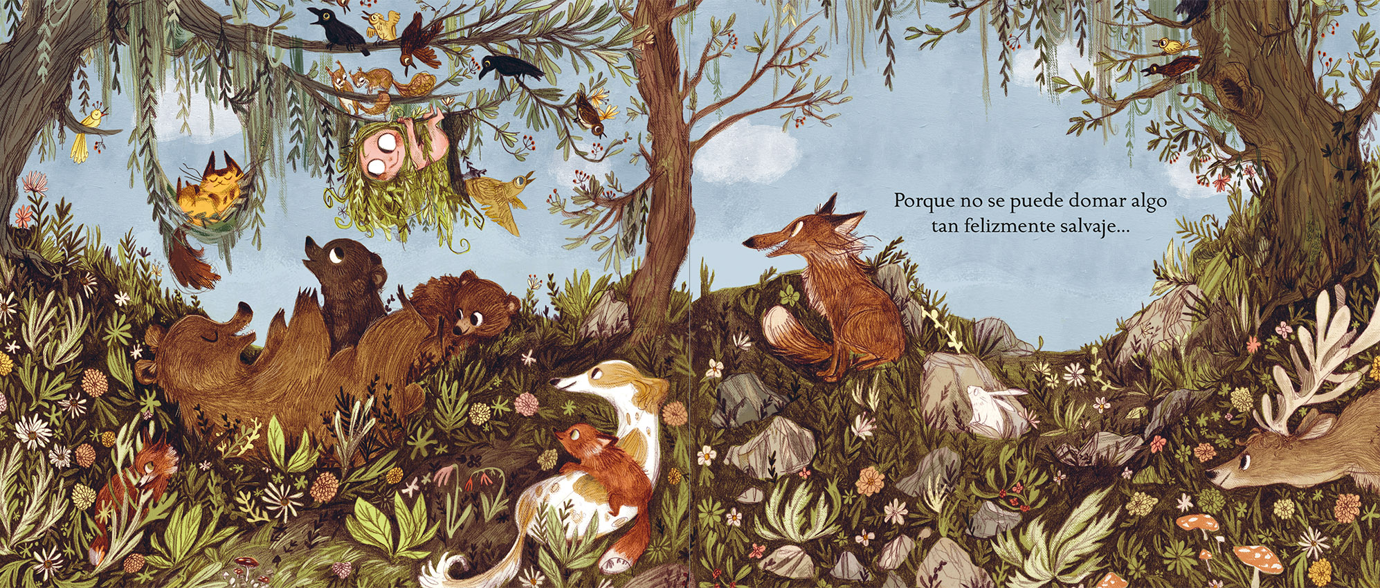 Emily Hughes consigue crear, en este álbum, una atmósfera verdaderamente salvaje, llena de color y de una vegetación exuberante en la que crece una niña al abrigo de los animales que la acogen. Una niña feliz hasta que el mundo humano “civilizado” la descubre. Un álbum que cuestiona nuestras normas sociales como verdades únicas. Una defensa de la libertad y de la naturaleza.