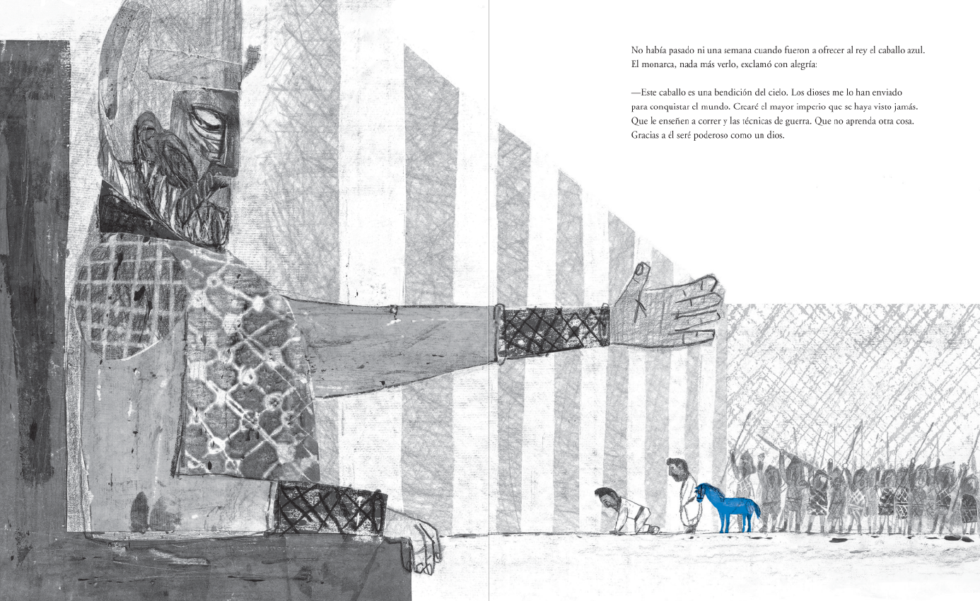 Un caballo azul está destinado desde su nacimiento a un duro entrenamiento como fetiche de guerra para deslumbrar al enemigo. Esta es una historia de resiliencia y de búsqueda de la libertad necesaria para enfrentarse a las imposiciones y lograr ser uno mismo. El artista coreano Yoo Jun-Jae utiliza una paleta de blanco, negro y azul con la que consigue contrastes fascinantes, logrando un álbum repleto de simbolismos.