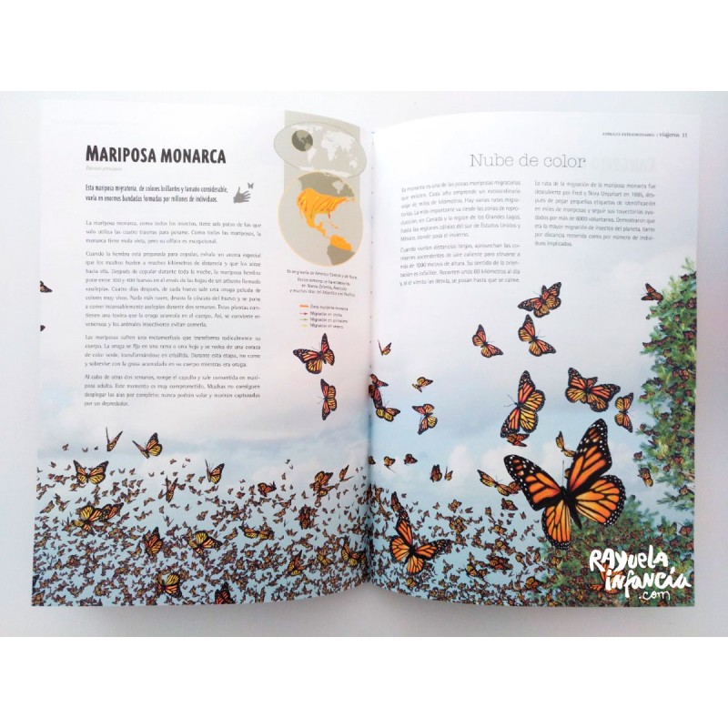 El tiburón ballena, la mariposa monarca, el cangrejo rojo... De cada una de estas 12 especies singulares dedica este espectacular libro de gran formato una doble página con información escrita y también visual.