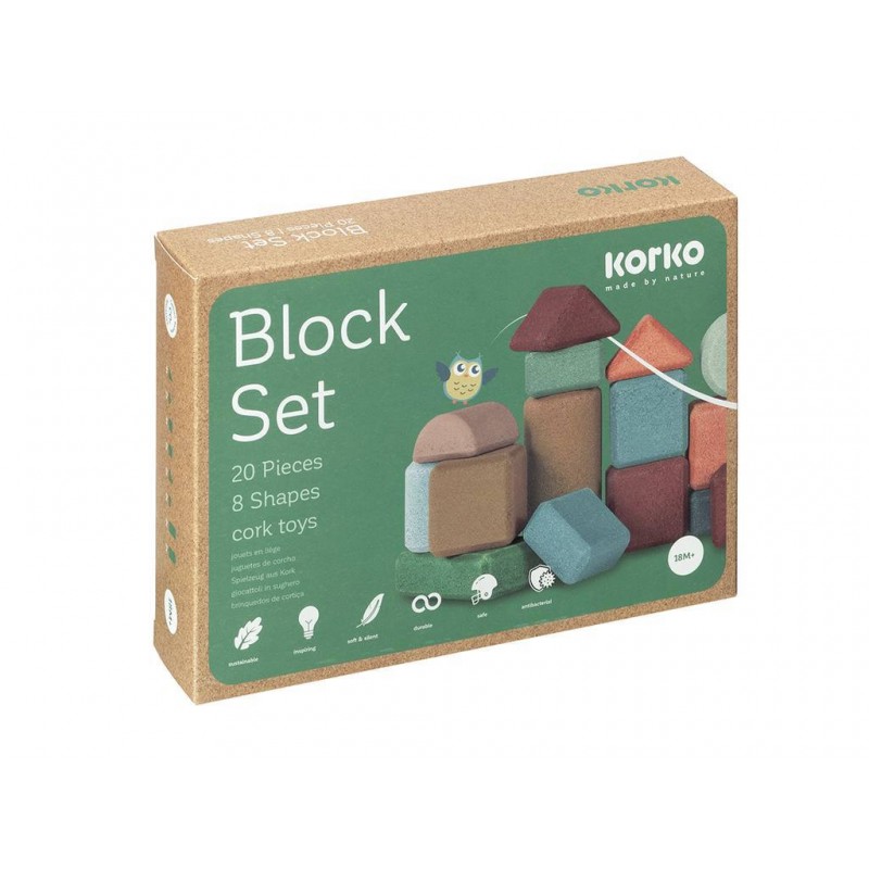 Un juego de construcción con 20 figuras de corcho ligero, compacto, seguro y sostenible. Horas y horas de juego creativo y de lógica espacial con este material muy libre que deja espacio a la imaginación.