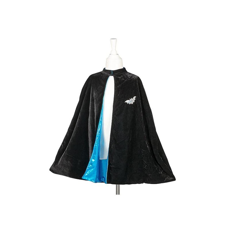 Dos capas en una: por una lado una capa brillante de superhéroe, por el otro una capa negra de terciopelo con murciélagos bordados... Elijas el lado que elijas la fantasía está asegurada.