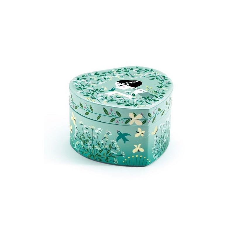 Una bonita caja de música con forma de corazón. Al abrirla una pequeña bailarina empieza a girar al son de la música. La melodía es Invitación a la danza de Carl Maria von Weber.