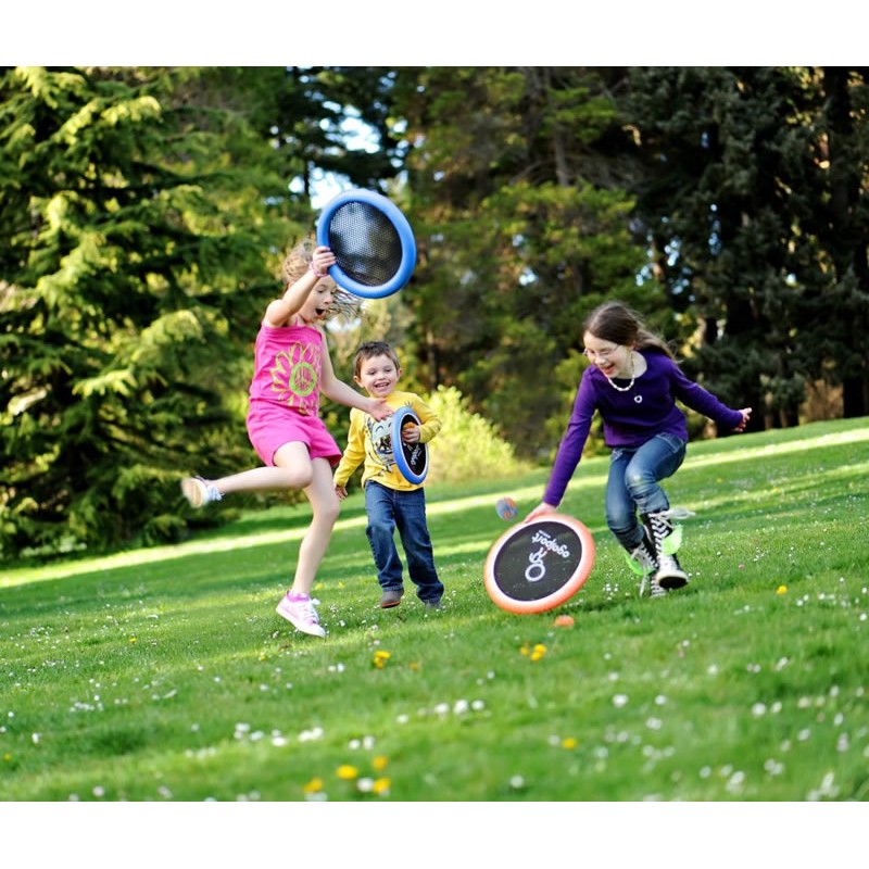 Estas raquetas en forma de disco sirven para jugar de muchas maneras diferentes: sirven para lanzar, para coger hacen rebotar. Puedes jugar con ellas al tenis, al bádminton, al voleibol... ¡Incluso con globos de agua!