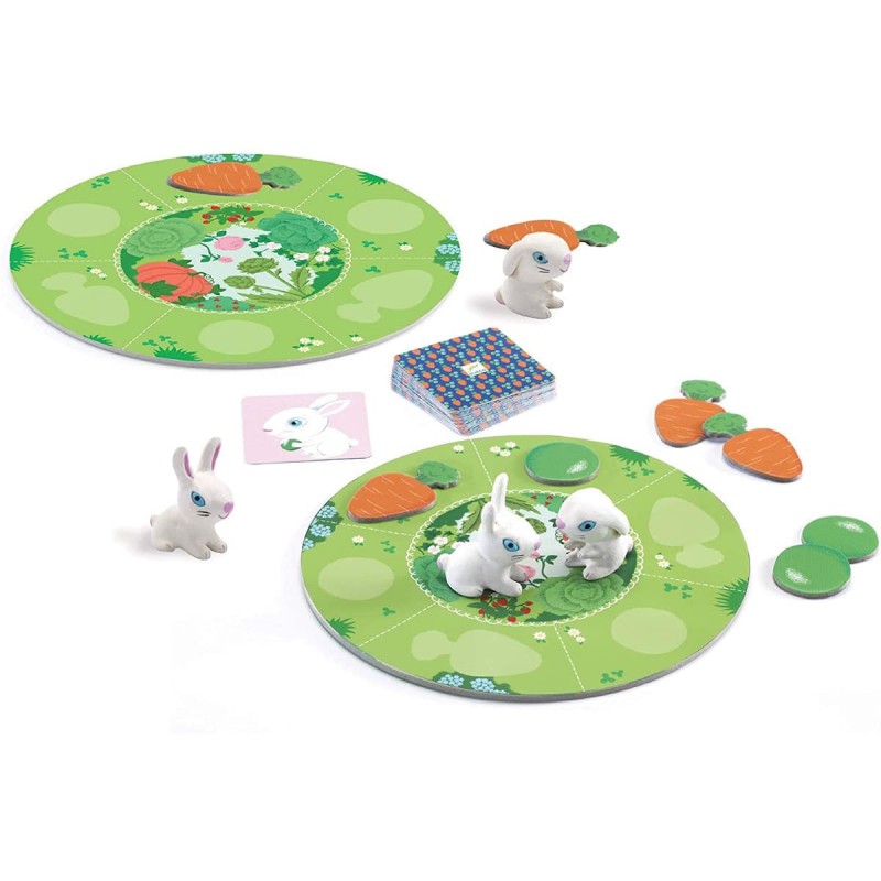 Un primer juego de mesa para peques. Un juego de recolección para jugar en familia dando de comer a los conejitos antes de que llegue el zorro.