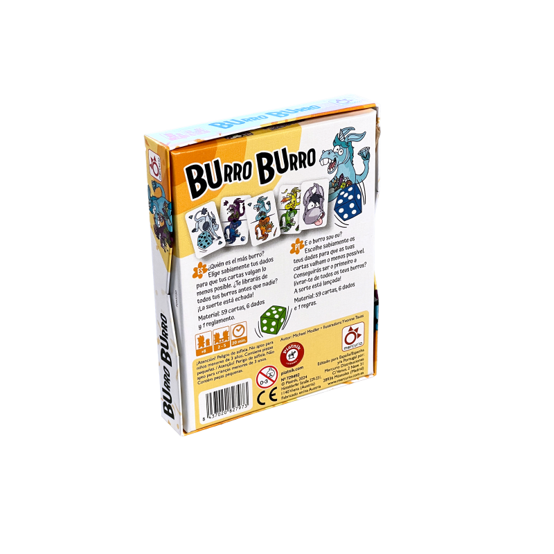 En el país de los burros, el asno es el rey... En este juego, todos sois asnos ¡Lo importante es no ser el más burro! Debes elegir sabiamente los dados para que tus cartas valgan lo menos posible y deshacerte de tus burros ¡La suerte está echada!