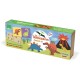Un primer juego de dominó de madera para los más pequeños, con ilustraciones de dinosaurios por una cara, y por la otra con los números clásicos de las fichas de dominó.