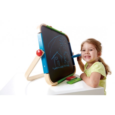 Esta fantástica pizarra portable se convertirá en uno de los elementos preferidos de juego de tu hija o de tu hijo por las mil posibilidades que les brinda. Por una cara es una pizarra de tiza, por el otro es de tipo vileda y magnética.