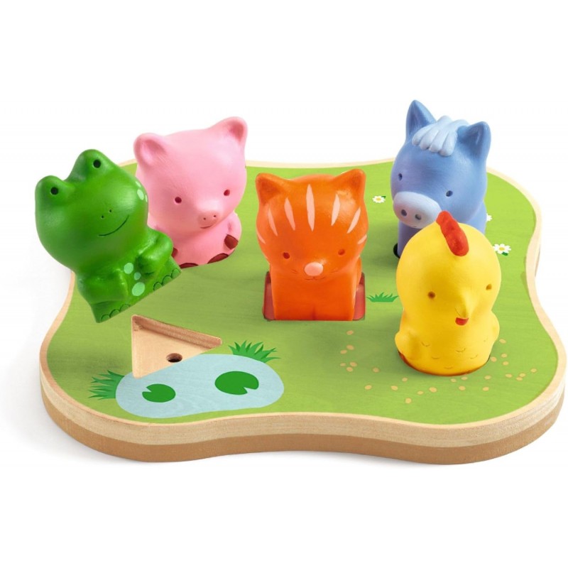 Un puzzle de encaje con 6 figuras 3D. Cada una de ellas tiene una figura geométrica en la base y al colocarla en su lugar escuchamos el sonido de cada animalito.